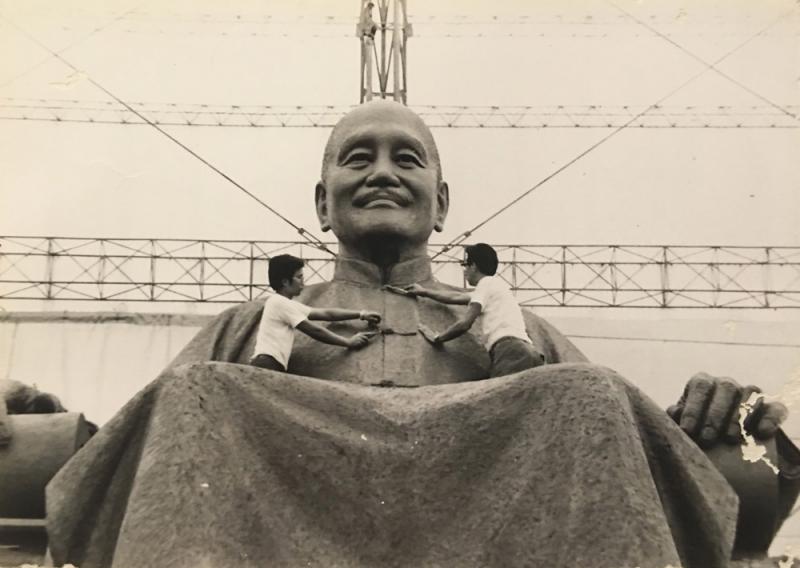 圖:一九七七年陳一帆和徒弟在雕塑蔣介石塑像\陳子文提供