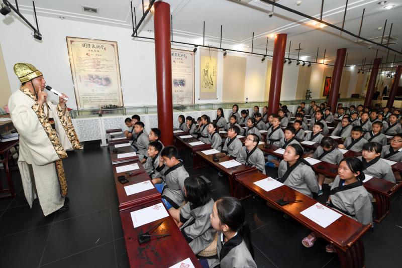 圖:參加第十五屆兩岸和平小天使互訪交流活動的「兩岸和平小天使」九日來到北京國子監,學習體驗傳統禮儀文化\新華社