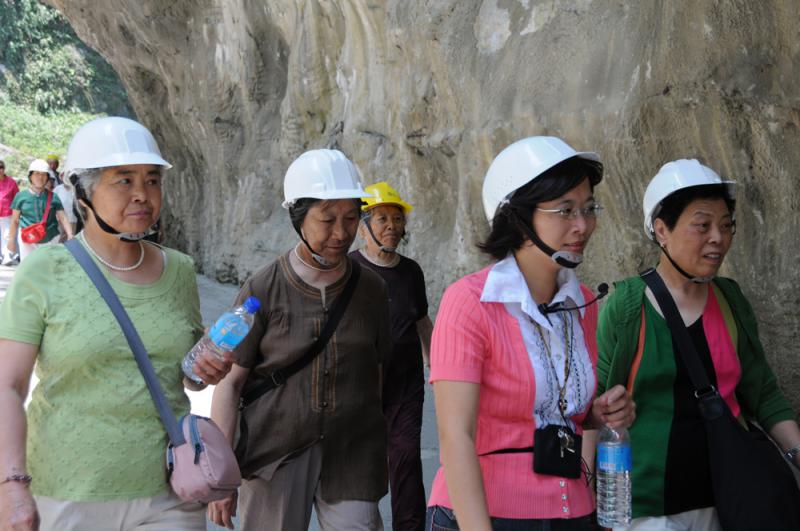 圖:花蓮太魯閣經常發生落石意外並造成傷亡,遊客都戴上頭盔\資料圖片
