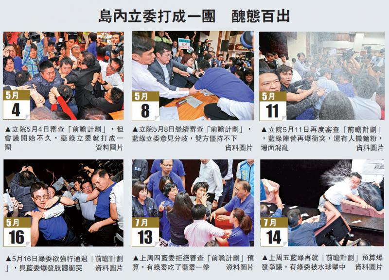 島內「立法院」近日審查「前瞻計劃」預算案,國民黨立委不滿民進黨立委早前以人數優勢強行通過「前瞻計劃」,於是杯葛預算案,雙方在「立法院」大打出手,醜態百出:搧耳光、丟水球、砸椅子。對於這些劣行,在美國著名媒體看來,台灣地區立委的議事水準和肯尼亞、尼日利亞、索馬里等「第三世界」無異。
