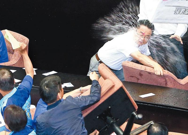 日前「立法院」處理前瞻基礎建設特別預算案,連續多日藍綠發生肢體衝突,國民黨團大丟水球、撒麵粉、扔雞蛋,汽笛喇叭、小蜜蜂音響此起彼落,造成會議現場十分混亂。