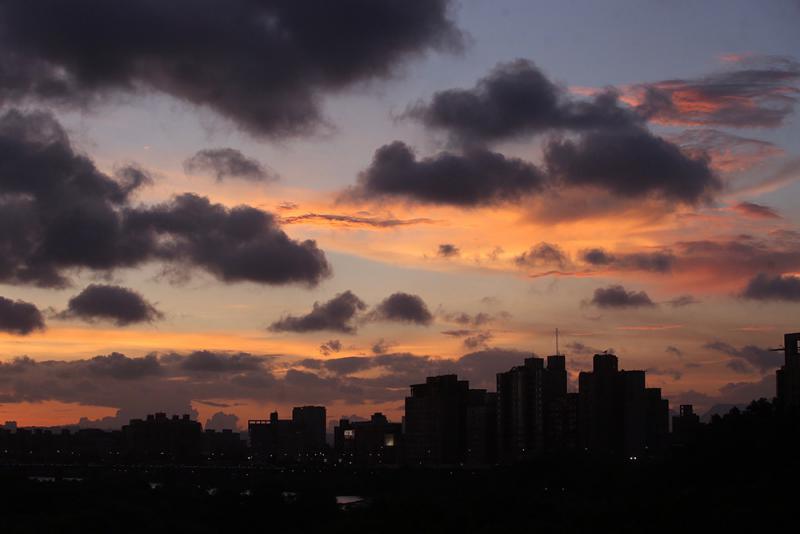 圖:28日傍晚有台灣民眾用相機在台北市一處河堤邊,捕捉颱風來臨前橘紅晚霞的美麗畫面 中央社