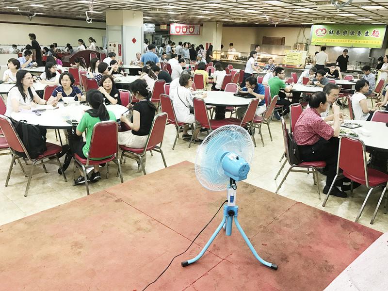 圖:颱風吹倒花蓮和平電廠電塔,台灣未來兩周面臨限電危機。圖為島內「中央聯合辦公大樓」地下室餐廳,中午時間擺設電風扇,降低室內溫度/中央社