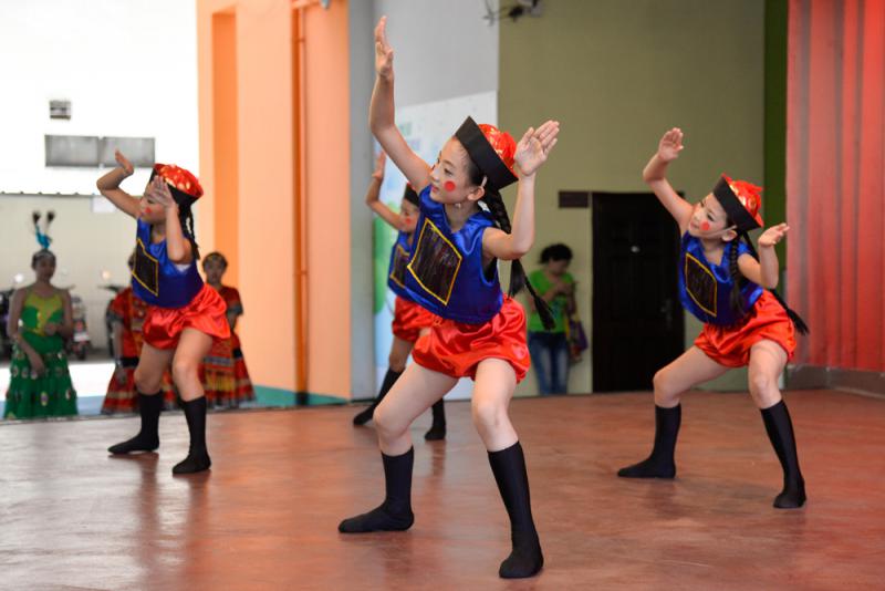 兩岸青少年親情之旅二日在海南海口開營。圖為高雄溪埔小學學生在姊妹學校海口博仁學校表演舞蹈節目。