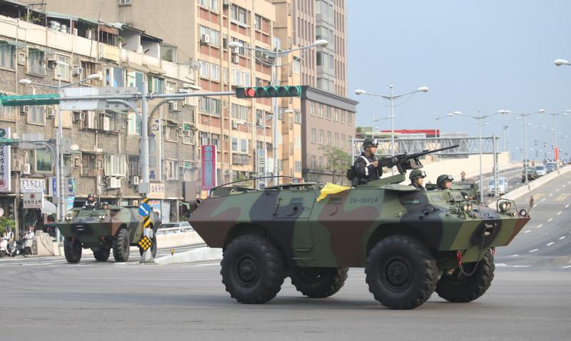 圖:島內年度政軍兵推從4日起至6日在台北共舉行3天。圖為4日下午第四批車隊V-150裝甲車從大直橋下來,前往衡山指揮所/中央社