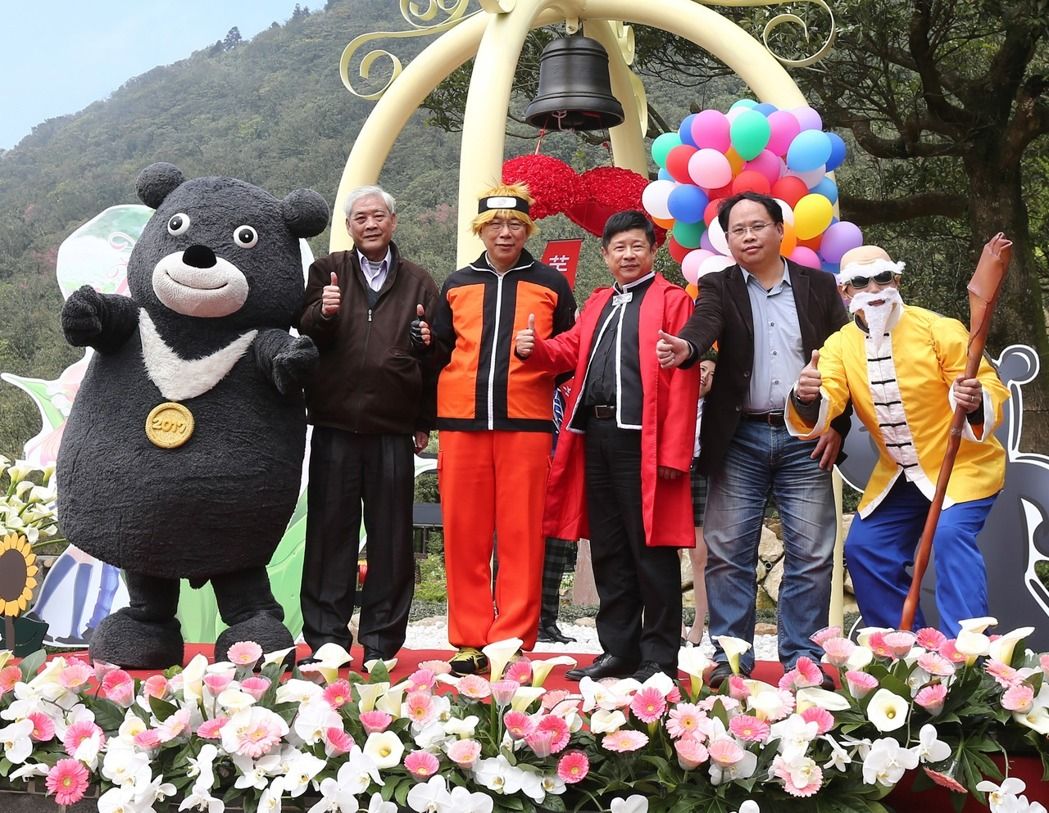 柯文哲(左二)打扮成火影忍者,出席2017竹子湖海芋季開幕活動。(網絡圖片)