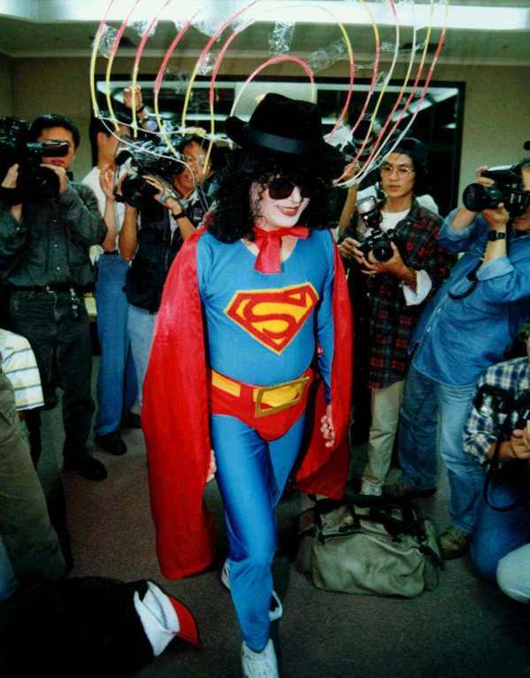1996年,陳水扁在台北市長任內的變裝經典作,集超人、宋七力和邁克傑克遜於一身。(網絡圖片)