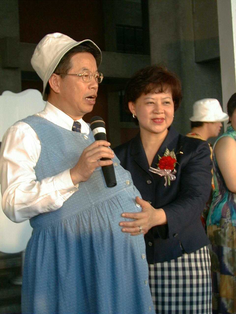 1999年,前高雄市長謝長廷為體驗媽媽辛苦扮成孕婦。(網絡圖片)