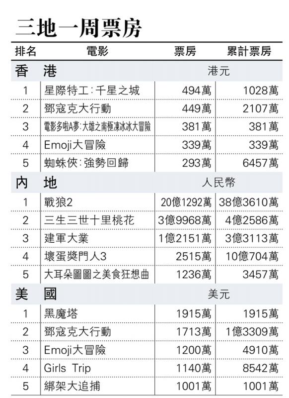 上周新上畫的影片,戲碼較弱,兩部合家歡動畫片未能開拓新的局面,票房首兩位仍是《星際特工:千星之城》(Valerian and the City of a Thousand Planets)和《鄧寇克大行動》(Dunkirk),兩部動畫電影,日本的《電影多啦A夢:大雄之南極凍冰冰大冒險》竟然贏了Sony的大製作《Emoji大冒險》(The Emoji Movie),有點意外。而總票房只有三千三百五十五萬港元,較前一周少了八十二萬港元。