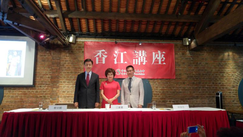 圖:陸委會前副主委鄭安國(左起)、香江文化交流基金會主席江素惠、台「中研院」副研究員林泉忠11出席「香江講座」/朱瑞宜攝