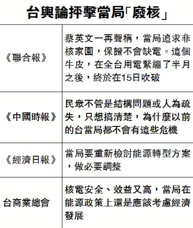 《聯合報》蔡英文一再聲稱,當局追求非核家園,保證不會缺電。這個牛皮,在全台用電緊繃了半月之後,終於在15日吹破