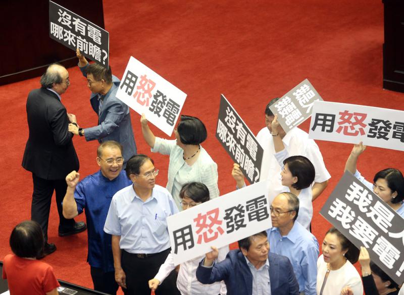 圖:國民黨擬「拉布」杯葛「前瞻計劃」。圖為上周國民黨立委在場內舉牌,高喊「沒有電,哪來前瞻?」等口號 資料圖片