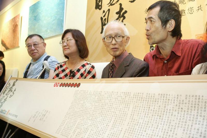 圖:島內多數教師反對刪減文言文比例。圖為12年前台灣著名作家余光中(右二)等人呼籲民進黨不能大刪高中語文課綱的文言文比例\聯合報