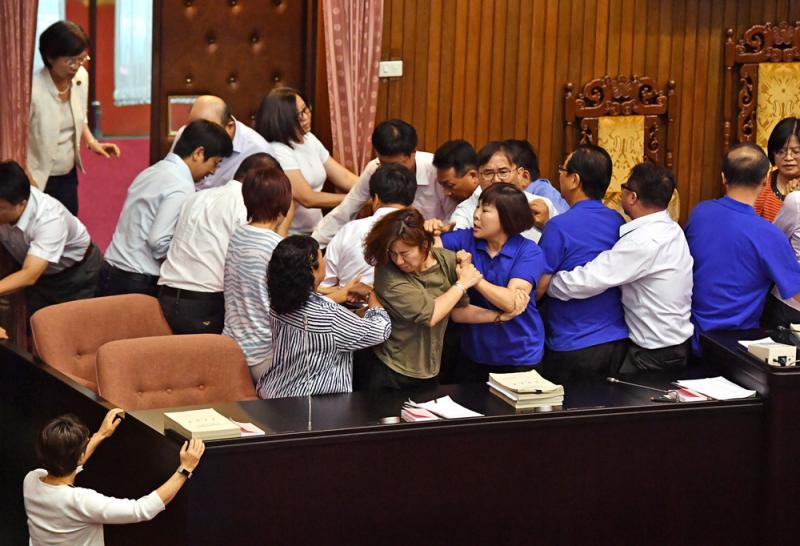 圖:「立法院」臨時會28日繼續處理「前瞻計劃」預算案,國民黨立委佔領主席台與民進黨立委發生推擠衝突\中央社