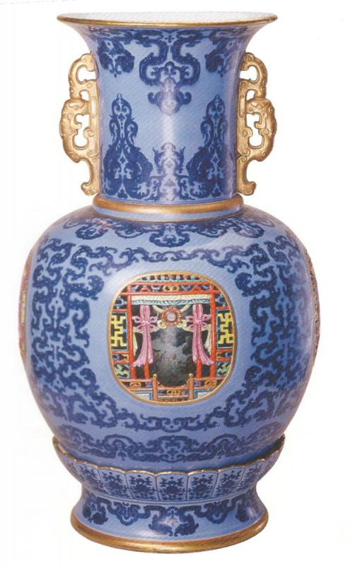 裝飾分藍釉金彩外觀裝飾與立體主題紋飾乾隆行圍圖兩部分。乾隆帝行圍圖的人物、景致皆按透視比例繪製而成。透過外瓶的漏窗望去,可見近處匍伏的臣子,乾隆帝在儀仗、侍衛相擁下策馬而來。遠處山巒隱約,前景、中景、背景之間空間疏密得當,尺幅畫面,盡顯意境深邃曠闊。瓶底飾湖綠色釉,鈐青花「大清乾隆年製」款。