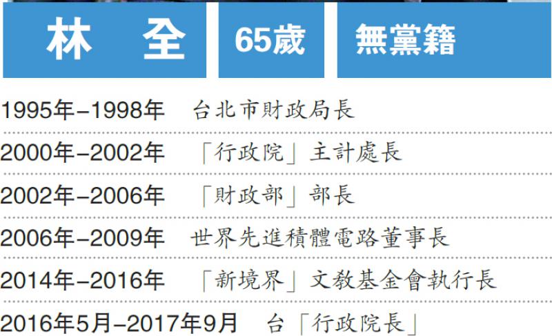 無黨籍的林全亦透露稱,今年6月時他就向蔡提到無意當太久的院長;也因明年地方選舉,會有很多政治性問題,這不是他的興趣,希望能有人接替,而「財政部」日前提出稅改方案,亦是工作可以告一段落的原因。至於接任人選,林全稱和蔡就人選交換過意見,有一致的共識。