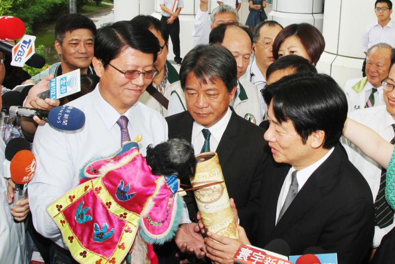 圖:台灣準「行政院長」賴清德(前右)6日在台南市議會向議員道別致意時,常與賴在議會上舌戰交鋒的國民黨議員謝龍介(前左)特別帶着布袋戲偶和蜂蜜送行致意\中央社
