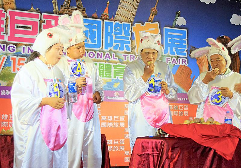 高雄旅展持續展開,16日舉辦中秋節應景趣味競賽「剝柚吃餅搶機票大放送」活動,參賽者們穿着兔子裝登台吃月餅,吃到藏着寫有機票大獎紙條的民眾就能幸運帶回獎品。 中央社