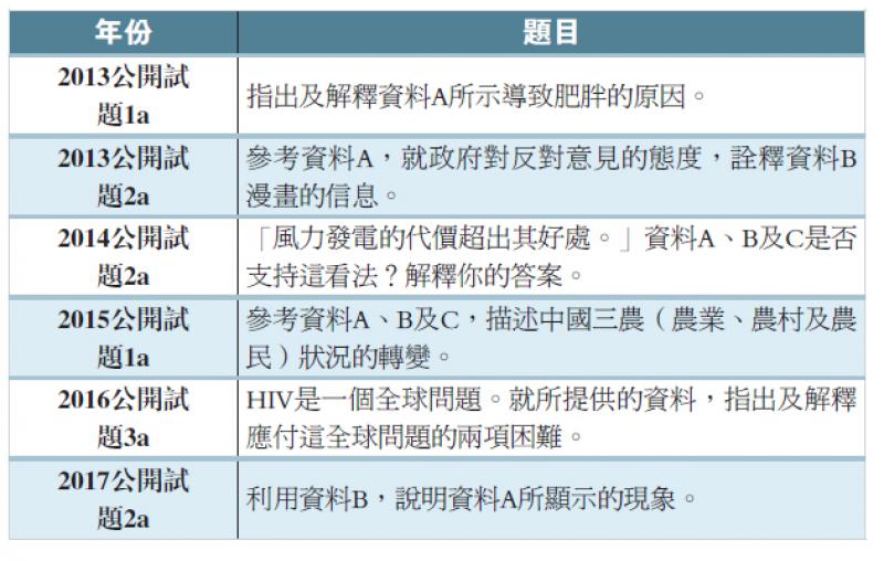 最後,漫畫詮釋題分別於2013年及2017年的公開試出現,可說是提問較直接及較容易組織的題型。考生宜多熟習如何運用資料作詮釋,以免因未有利用指定資料佐證白白失分。例如上文已述2017年漫畫的現象,題目要求考生除了辨識此現象外,更需要利用資料B說明現象所指涉及的持份者或群體。