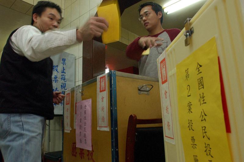 圖:12日,台灣「立法院」三讀通過修正「公投法」,將「公投」門檻大幅下調。圖為2004年3月台當局將「總統」選舉與「防禦性公投」捆綁投票/資料圖片