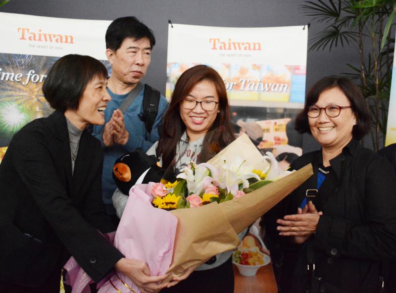 二十三歲的新加坡旅客陳珏甹(右二)十二日上午乘機抵達桃園機場,幸運成為今年赴台的第一千萬名旅客,獲贈華航經濟艙機票兩張,以及台北、高雄、花蓮酒店住宿券與台灣特色好禮/中央社