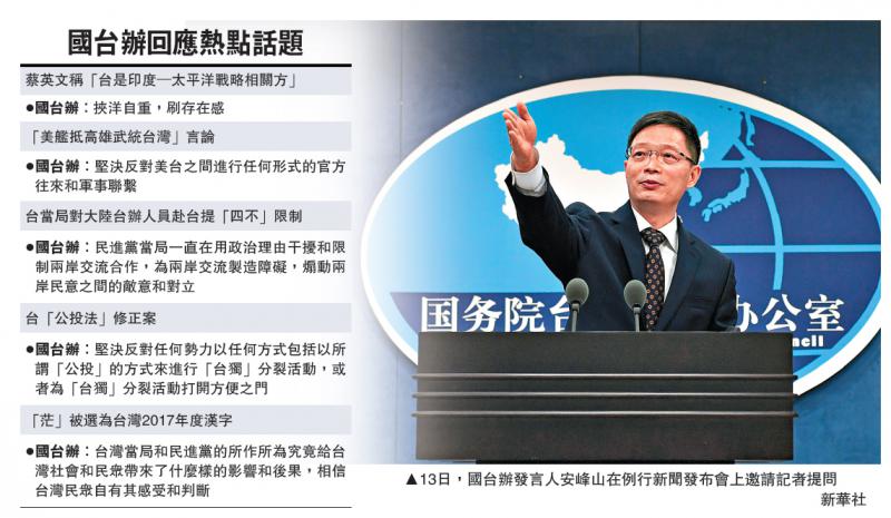 據新華社、中新社、環球網報道:針對蔡英文11日見「美國在台協會」主席時提到「印太戰略」,稱「台灣是自由開放的印度─太平洋戰略的相關方」,可在該區域作出更多的貢獻,有記者詢問發言人看法,安峰山以「挾洋自重,刷存在感」八字回應。