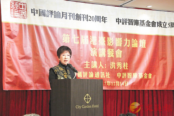 洪秀柱當天出席第七屆港台影響力論壇暨中國評論月刊創刊20周年、中評智庫基金會成立5周年餐會,並發表「兩岸交流三十年及未來」演講。