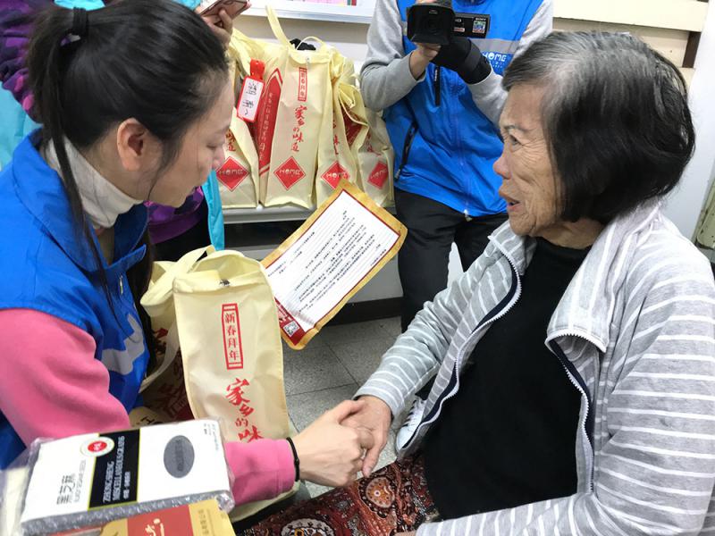 住在如意新村的孫秀雲奶奶已經來台超過一甲子,另一半十多年前過世,子女多在境外。對於自己的身世,孫奶奶不願多談,但當她從志工手上接過來自家鄉的特產品時,激動落淚,握着志工的手,久久不能言語。