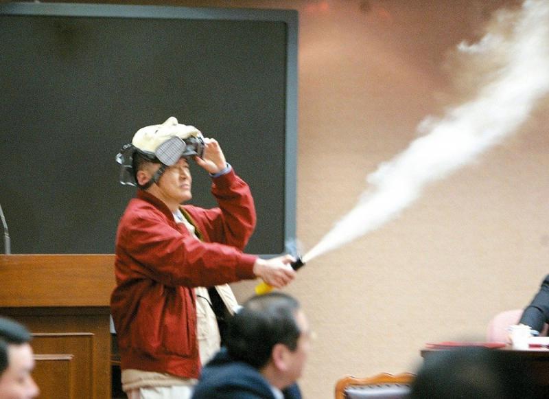 圖:二○○六年李敖為阻撓軍購案,在立院會場噴灑催淚瓦斯/資料圖片