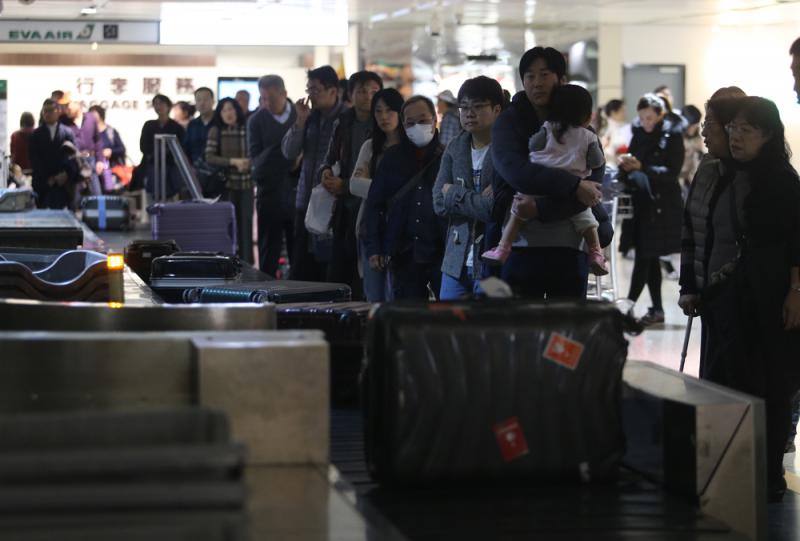 圖:桃園機場第二航廈22日上午兩度跳電,不少旅客在昏暗的光線下領取行李 中央社