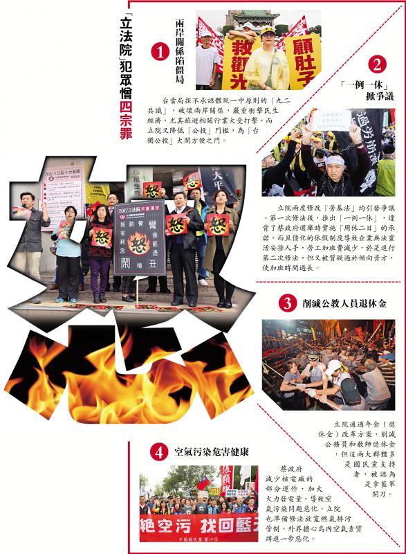 島內「公民監督國會聯盟」28日公布「立法院」年度漢字票選結果,由「怒」字奪冠。「公督盟」執行長張宏林表示,希望所有立委知道,人民對他們今年的表現,以怒字作收。台灣學者指出,之前民眾選出台灣年度字是「茫」,現在「立法院」年度字是「怒」,代表台灣民眾對民進黨掌權下的「行政院」和「立法院」強烈不滿。