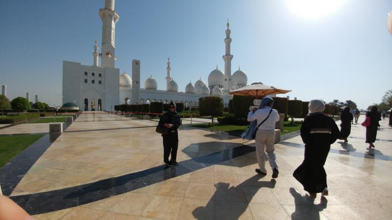 工作範圍內,在阿布扎比被安排參觀的另一個主要景點為謝赫扎耶德大清真寺(Sheikh Zayed Grand Mosque)。接近四十人的團隊,要進入這著名的清真寺,真的花了我們不少心血。雖然要面對火辣的太陽,團友們還是很聽話地遵照服飾的要求,包頭、包身、包腳、包手,可是標準始終由當地的工作人員來衡量,男士們順利過關,女士的開衩長裙、褲子質料太薄或是太窄,全部被擋在安檢之外。偏偏現場租借伊斯蘭傳統長袍的服務,不開放予團體的個別單位。可幸我們有可愛的團友,披肩、絲巾,能夠派得上用場的,只要自己能夠安全達壘,便全數借出;其中一個團友,更可騰出一套額外的伊斯蘭傳統長袍,真有先見之明。不過,「拼拼貼貼」的結果,最終我這位勉強過關的工作人員還是得跑一趟場內精品店,即場購買一套長袍,才總算全數抵壘。