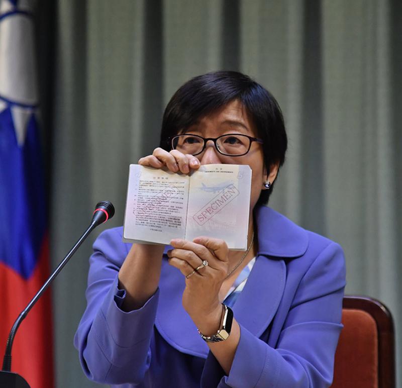 圖:台外事部門12月31日晚召開臨時記者會,「領事事務局」副局長蔡幼文向媒體說明誤植圖樣「護照」以加貼防偽貼紙的方式來補救\中央社