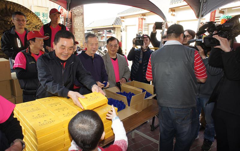 南投縣竹山鎮紫南宮推出「旺來富」狗年「錢母」(小圖),1日首波發送,相傳「錢母」能夠招財,故吸引逾5萬人排隊7公里領取。 中央社