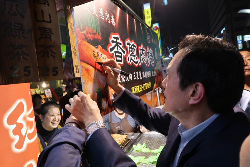 圖:馬英九在跨年夜現身高雄六合夜市,並在攤商招牌上簽名\中央社