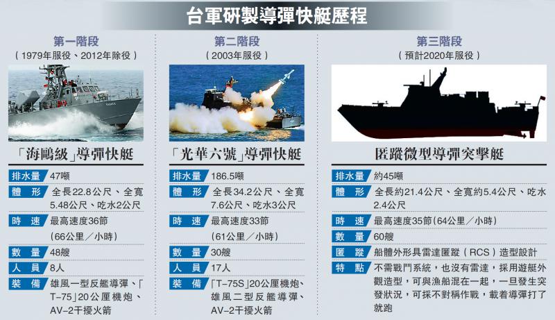 【大公報訊】綜合中通社及中央社報道:對於有媒體報道指,「解放軍積極建造新式作戰艦及航空母艦,台軍為反制解放軍的大海軍戰略,由島內「國防部參謀總長」李喜明提出籌建匿蹤微型飛彈突擊艇的構想,台「國防部」證實,軍方預計在4年內建造60艘45噸的匿蹤微型飛彈突擊艇。
