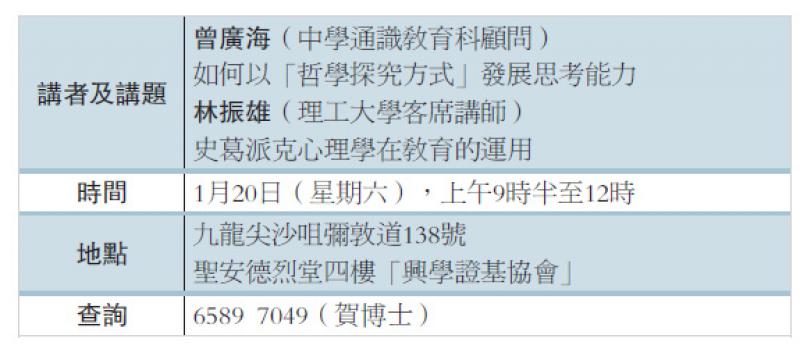 在DSE各科報告中,經常見到一些主考評語,批評考生解錯題、對重要抽象概念一知半解。尤其在口試時,只顧談自己看法,不理別人意見的弊病。「哲學探究教學法」,可幫助學生學習複雜的抽象概念、解決「答非所問」的問題、不理別人意見,自說自話及在課堂內不愛發問的普遍現象。為此,基督化通識教育資源中心.興學證基協會.宏恩國際集團舉辦「通識與信仰講座」。