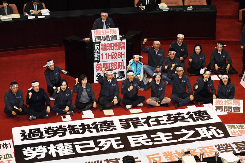 圖:國民黨立委9日在「立法院」審議勞動基準法,頭綁布條並擺上大海報,批評當局把勞基法修改得越來越差\中央社
