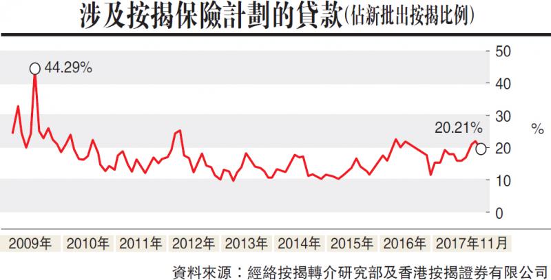 現時樓價不斷破頂,400萬以下的物業才有承造九成按揭的措施早已不合事宜,政府擬放寬按保成數,相信可幫助上車一族及換樓人士置業,刺激二手市場的交投,令流轉量加快。事實上,自2009年政府開始實拖樓市監管措施,並將按揭成數上限調低,按揭證券公司於其後暫停接受逾九成按揭貸款申請,涉及按揭保險計劃的貸款佔新批出按揭比例曾經由高位的44.29%下跌至2017年11月份的20.21%,相信若政府放寬按保成數,市場需求增加,數字可上升至四成水平(見配圖)。