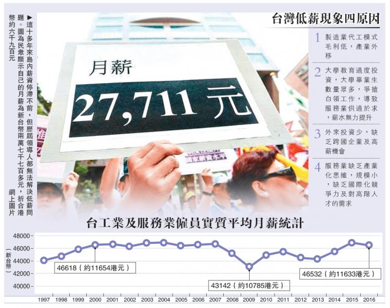 台灣現代服務業面臨投資不振的情況。部分製造業外移後,大量人力投入薪水偏低的傳統服務業。台當局財政事務主管部門此前公布一項基於財稅大數據的分析報告指出,員工薪資高低與所屬企業規模大小高度相關,低薪群體中近95%來自非上市櫃公司;此外,佔比近25%的低薪群體多屬於40歲以下的青年群體、從事勞力密集型工作(如美容美髮、飲料店、餐館等)。