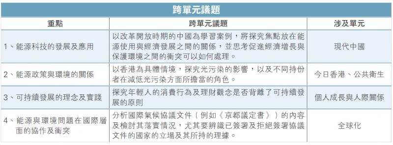 「能源科技與環境」的學習重點,包括能源科技的發展如何影響大眾的生活、使用能源與經濟發展的關係及所引起的環境問題、能源政策與生活素質、可再生能源的分布對國際關係的影響等。另一方面,可持續發展的理念及推廣,以及不同持份者如何為可持續發展的未來承擔相應責任等,都是本單元的探究方向。概括而言,建議教師將本單元的學與教重點歸納為以下四項: