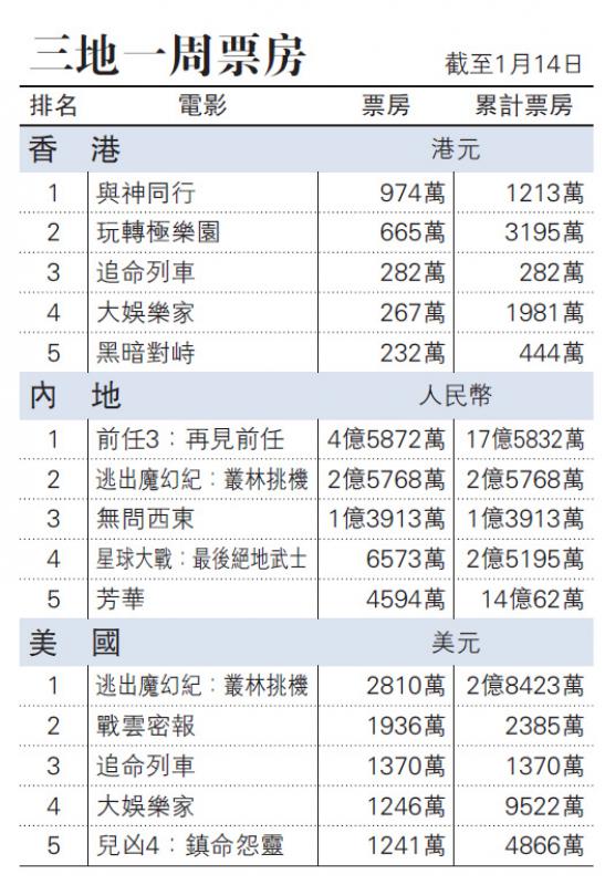 大節過後,香港票房上周延續前一周的淡季氣氛,一周共收三千二百九十七萬港元,較前一周少收五百四十五萬港元。票房榜第一位由新上畫的韓國電影《與神同行》奪得,加上之前的優先場共收一千二百一十三萬港元,算是一個不錯的開始,可是離前年《屍殺列車》的六千八百萬港元,還有一段距離;第二位是動畫大片《玩轉極樂園》(Coco),第三位是新上畫的動作片《追命列車》(The Commuter),《大娛樂家》(The Greatest Showman)和《黑暗對峙》(Darkest Hour)為第四、五位。雖然《追命列車》排第三位,可是跟第一位的票房相差近四倍,落差甚大。