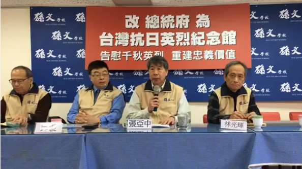 張亞中表示,日本殖民統治台灣期間,至少有40萬同胞遭受殘害,但是,也有更多可歌可泣的台灣忠義之士,不惜以鮮血抵抗,留下了不少悲壯的史詩,因此孫文學校希望透過「公投」,將現有的「總統府」,改為「台灣抗日英烈紀念館」,以告慰這些為台灣人尊嚴而犧牲的英烈。