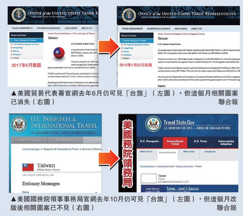 美國政府多個網站紛紛撤下「中華民國國旗」相關圖案。對此,華府明確表示堅持「一中」政策,而台當局於24日表示不滿,稱「無法理解美方作為,無法接受」。國民黨指出,這對比前些日子蔡英文當局沾沾自喜美國眾議院通過「台灣旅行法」,顯然是一大諷刺。島內學者表示,這是美台關係的一個警訊。蔡政府把美國當靠山,但台灣對美國而言不過是可用可棄的棋子而已。