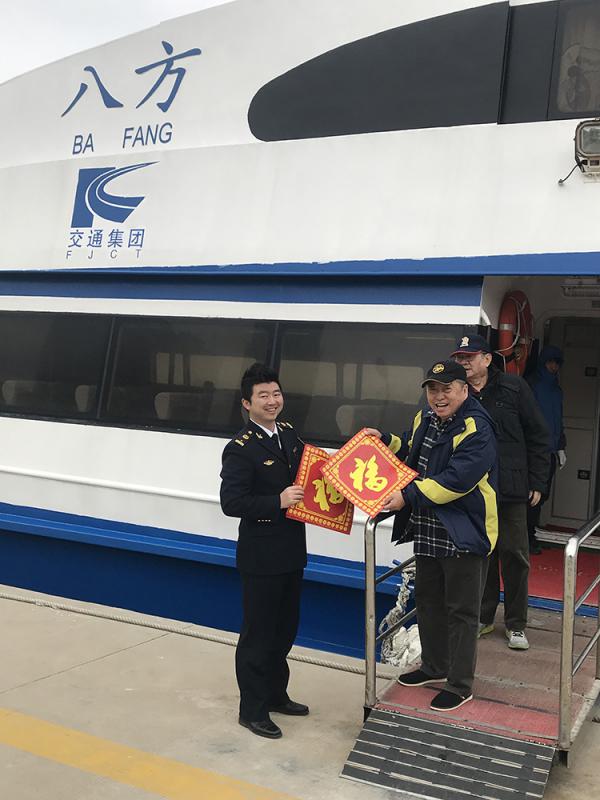 泉金航線海事處執法人員在春運第一天,特意為即將出港的「八方」輪及台胞送去精心準備的福字和春聯,提前送去新春的問候。泉金線每天正常運營10個班次,大年三十及初一部分班次停航,其他航班正常,初二起航班恢復運營。廈金航線每天往返36個航班。據廈門五通碼頭負責人介紹,除2月15日(除夕)下午提早下班外,其他航班及開航時間均不變。