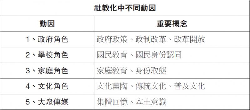 社教化是社會學中最為廣泛運用的其中一個概念。每個群體都有一種特定的、被視為恰當的態度、價值觀及行為模式,用以維持日常的社會運作和人際溝通。社教化讓每個人了解自己在社會上被賦予的「角色」,並學習實踐該「角色」應有的行為。當我們將此概念應用於「今日香港」單元時,便認識到有什麼動因(agents)影響了港人建立身份認同的過程,這些動因包括:政府角色、學校角色、家庭角色、文化角色、大眾傳媒等。只要能掌握社教化這些動因,在面對「今日香港」單元的議題時,便會有更全面的分析角度去回應。