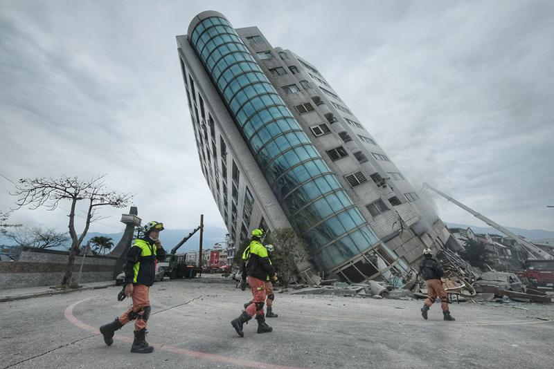 圖:台灣花蓮縣6日深夜發生6.5級地震,搜救人員7日在45度嚴重傾斜的雲門翠堤大樓救援\中央社