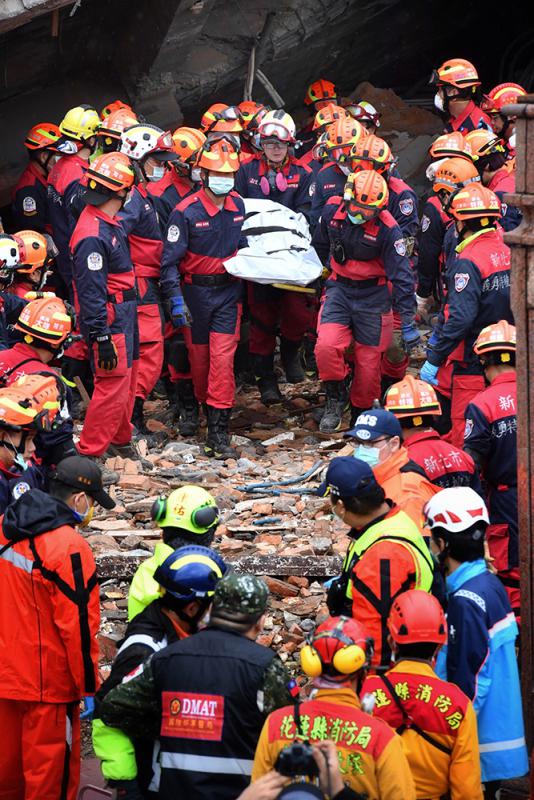 圖:新北搜救隊8日從瓦礫廢墟中抬出「漂亮生活旅店」的員工江振昌的遺體\中央社