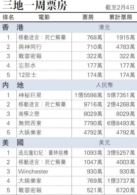 兩部奧斯卡提名片《戰雲密報》(The Post)和《忘形水》(The Shape of Water),只能排第三、四位,前者有梅麗史翠普(Meryl Streep)和湯漢斯(Tom Hanks)兩位紅星,吸引力明顯較後者為佳;而另一部新片《12壯士》(12 Strong)只能排第五位,雖然有「雷神」基斯咸士禾夫(Chris Hemsworth)主演,吸引力也不大。