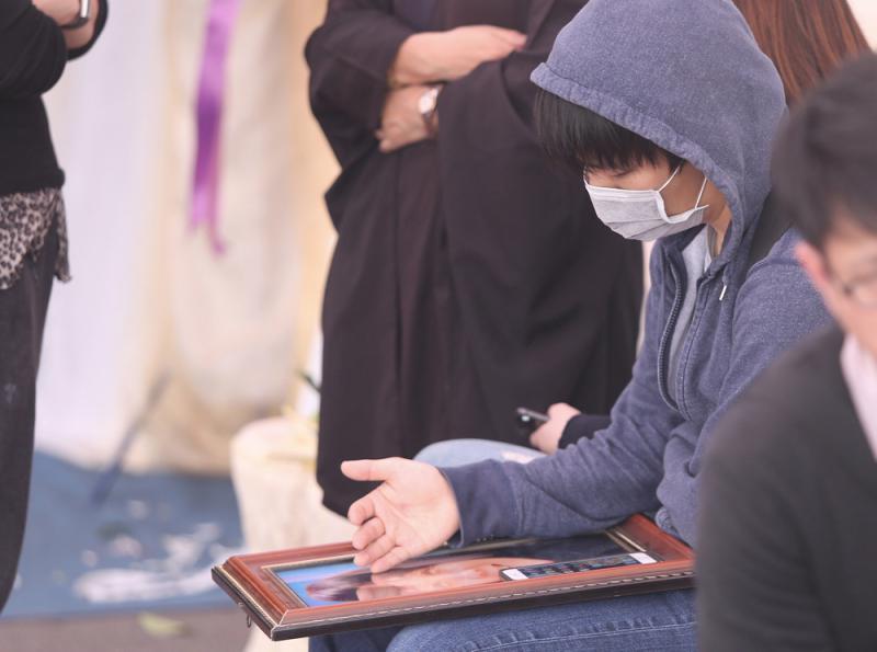 圖:遇難陸客韋嘉的兒子韋思奇在法會現場輕撫母親遺照,神情哀戚\中央社